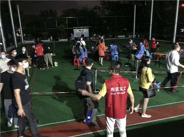 烈日高溫、狂風暴雨,惡劣的天氣下,儘管夜幕降臨,布吉街道的各個核酸檢測點卻依然燈火通明,居民群眾絡繹不絕地前來排隊做核酸檢測。