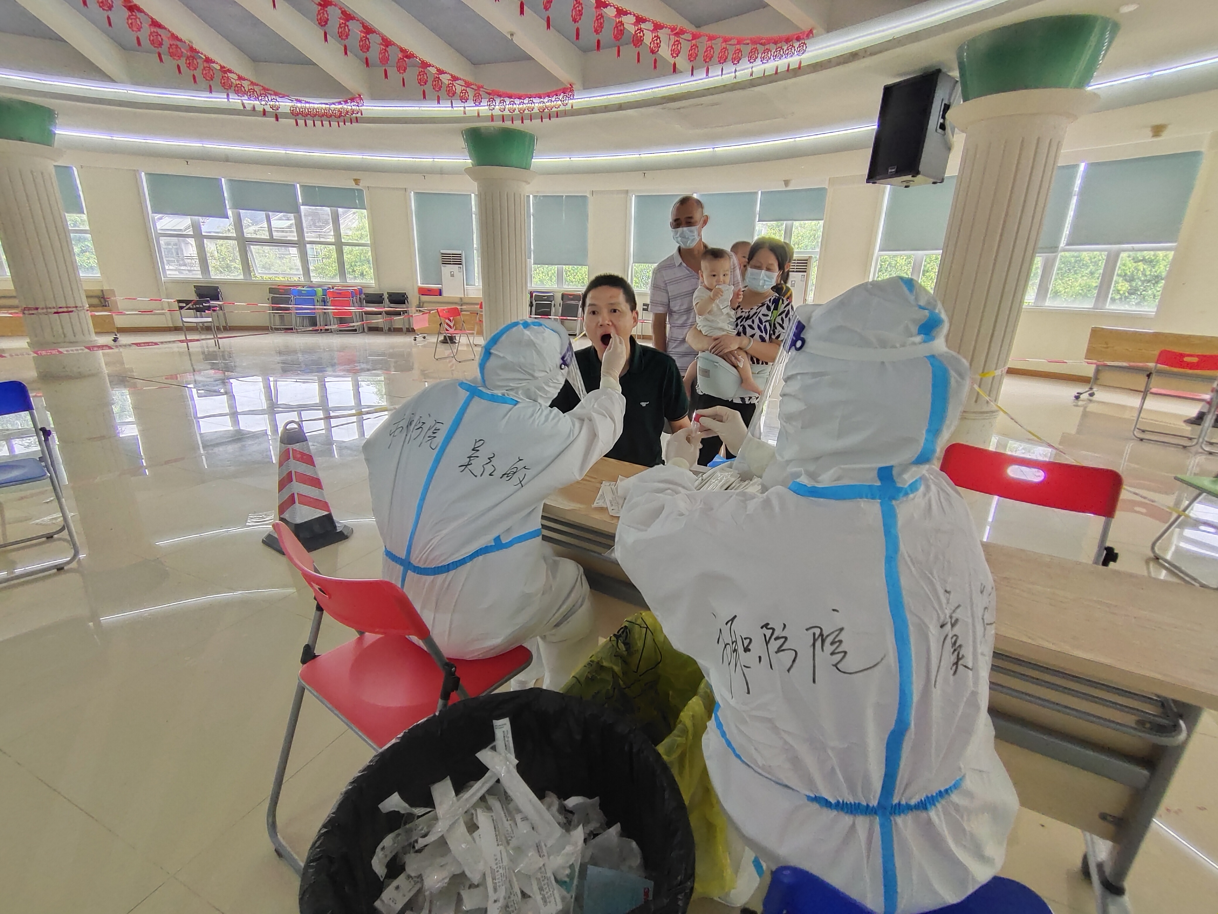 但虞敏萬萬沒想到的是,這支年輕力壯的團隊,在支援的第一天,好幾名醫護的身體就紛紛出現了問題。5月31日,連續多日的高溫,沒有降低的跡象,這座熱帶城市的酷暑才剛剛開始,一大早的氣溫就飆升到30度,悶熱難耐。各大醫院支援的大巴陸續在吉華街道大院集結,虞敏團隊經過簡單的清點,便迅速前往三聯儲運學校監測點。到達學校,正準備大幹一場的他們遇到了難題——停水停電!下午2點開始,學校師生陸續前往檢測點檢測,教室不通風、防護服不透風,醫護人員無疑不在經受着蒸桑拿考驗,防護面屏上很快就被身體散發的熱氣佈滿,模糊不清,舉手投足間防護手套不停的滴落出汗水,幾個護士相繼出現了中暑的跡象。經過短暫的休息,他們繼續投身取樣任務。第一天,虞敏團隊完成了近6000個標本採樣。