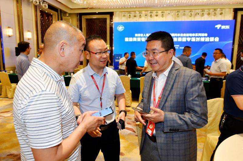 對接洽談會上,陝西省貿促會副會長權儉,京東集團副總裁、西北分公司總經理朱成成分别致辭,陝西省商務廳和京東物流、京東科技、京東健康、京東零售等部門負責人現場推介。陝西省級有關部門,西安、寶雞、咸陽、渭南等9個市區(縣)商務、衛健、招商部門的負責人和參會的企業負責人與京東集團業務人員現場洽談,取得良好成效。