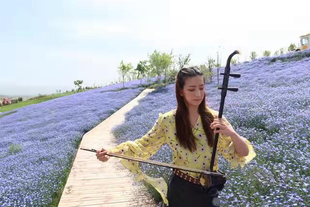 採訪團首先來到榆中縣李家莊田園綜合體。在海拔2000多米的野奢民宿,台青們被草長鶯飛的山頂風光、別致素雅的民宿設計深深吸引,紛紛拍照打卡,並在民宿前合唱台灣民謠,現場通過新媒體平台推介了這個集「游購娛」為一體的多業態鄉村旅遊觀光打卡地。在距離民宿不遠處的蘭花亞麻花海中,來自台中的音樂老師李顏如用二胡在藍色花海中深情演繹了台灣名歌《小城故事》,向兩岸民眾傳遞着如夢如幻的榆中田園風光。