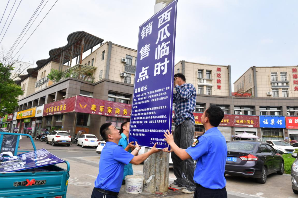 夏季正是西瓜銷售旺季。瓜農進城能在哪些區域賣瓜?吃瓜群眾在哪裡能方便買瓜?從6月2日起,安徽省巢湖市城管局四個執法大隊同時在各轄區內,開始安裝設置34個西瓜臨時銷售點標牌,既方便瓜農賣瓜、居民就近購瓜,也有效解決了瓜農路邊擺攤設點影響市容難題。