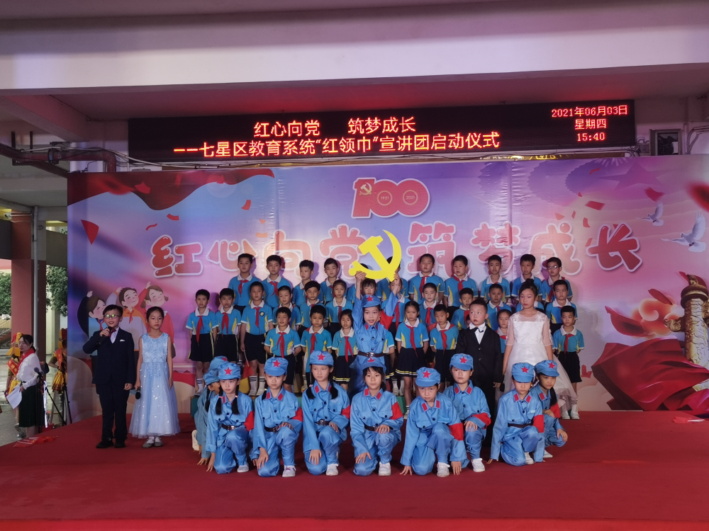 據七星區教育局主要負責人介紹,今年以來,七星區教育局通過黨建帶團建、帶隊建的形式,廣泛開展各式各樣豐富的「從小學黨史 永遠跟黨走」黨史學習教育進校園活動。各學校以「紅領巾」為主體,各校的優秀少先隊員組成「紅色」黨史講解員隊伍,利用思政課、班隊會等時間,根據學生各年齡段特點,生動鮮活講好中國共產黨的故事,引導轄區廣大青少年以實際行動參與黨史學習教育,親身感受紅色歷史。(歐陽萍 王亞東)