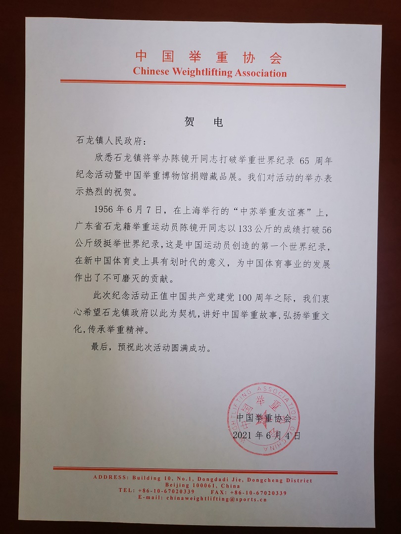 1956年6月7日,石龍人陳鏡開以133公斤的成績打破最輕量級挺舉世界紀錄,創造了新中國第一個體育世界紀錄,其運動員生涯中共十次打破世界紀錄。是中國首批運動健將之一,五次獲國家體育運動榮譽獎章,榮立特等功一次,一等功兩次,是第二至第五屆全國人大代表,先後受到毛主席六次接見。1987年5月11日,國際奧委會授予他奧林匹克銀質勳章;1997年入選國際舉重聯盟名人館,並任亞洲舉重聯合會終身名譽主席。以陳鏡開為代表的舉重人把舉重精神用汗水詮釋得淋漓盡致,舉重精神是一代又一代的舉重人把民族尊嚴、國家榮譽看得高於一切的精神;是頑強拼搏、奮勇爭先的精神;是不斷進取、突破自我的精神。石龍人民始終秉持和弘揚舉重精神,不忘初心、牢記使命,開拓進取,奮力建設灣區高品質名鎮,實現中華民族偉大復興「中國夢」的道路上再立新功。(記者 冷運軍)