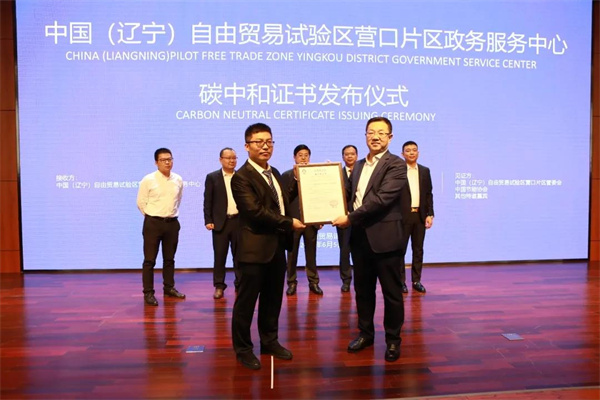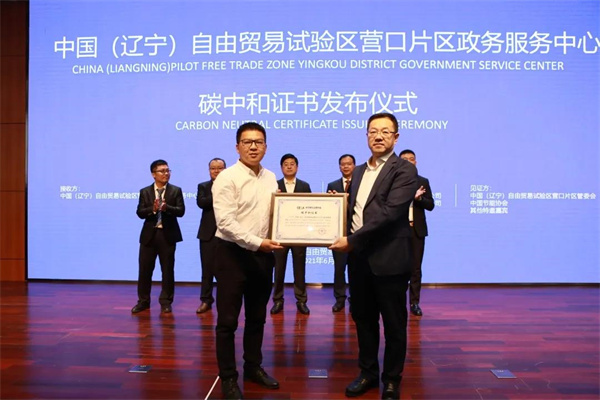 日前,中國節能協會和中國船級社認證公司向營口自貿區政務服務中心頒發了「碳中和」證書,這是東北地區首張政府機關辦公區「碳中和」證書。