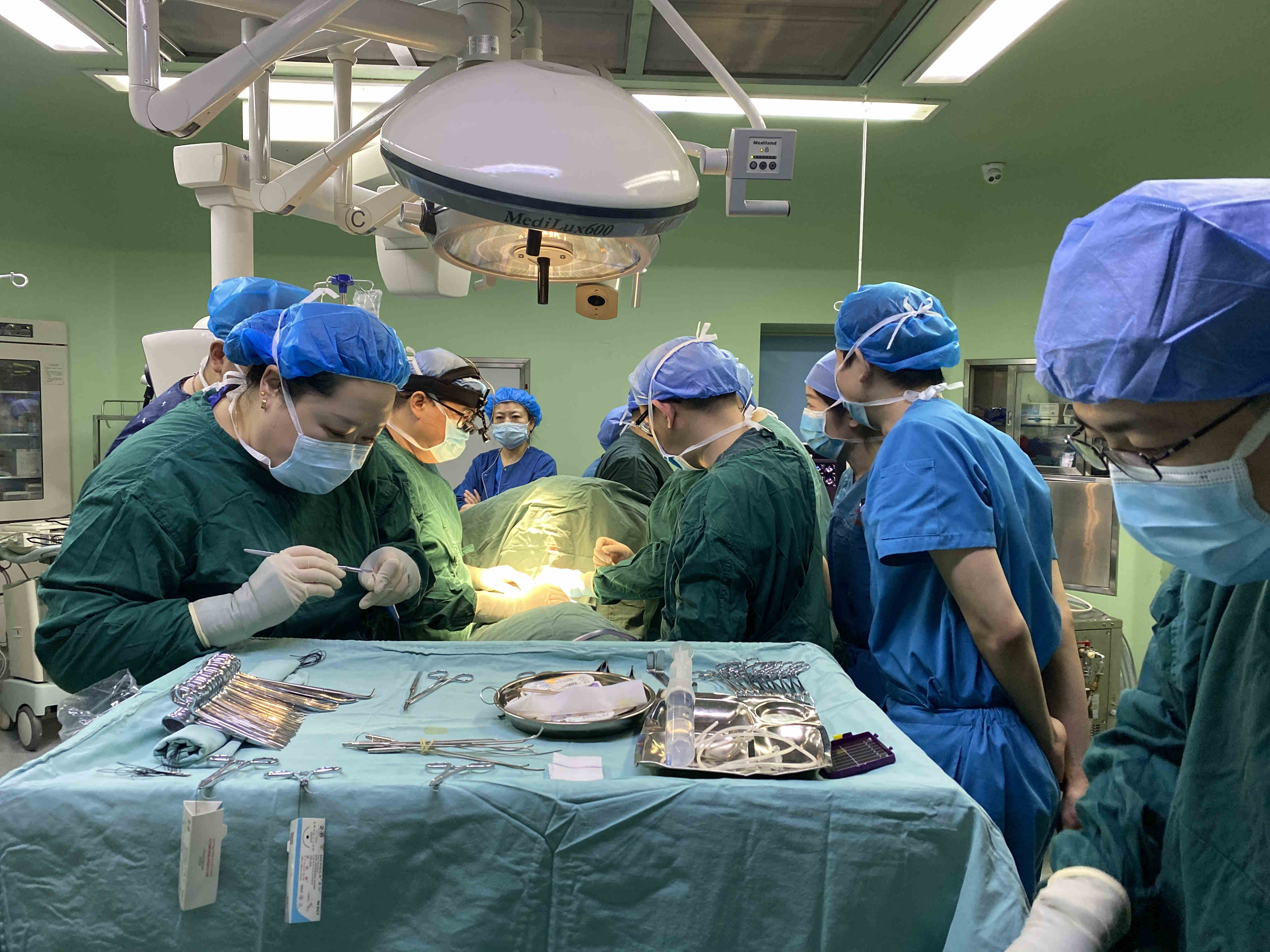 5月30日,在麻手科楊狄主任的全力配合下,手術順利進行。術中見到患兒原發孔巨大房缺約25mm,心內十字交叉處原本的兩組房室瓣融合為一組畸形共瓣,腱索附着於室間隔斷端右室面,室缺約3mm。李志強教授利用改良單片法間斷縫合將房室瓣下壓至室間隔上,二尖瓣見巨大瓣裂,注水可見大量返流,縫合瓣葉裂,並行二尖瓣成型,修補後再次注水無返流且無狹窄。