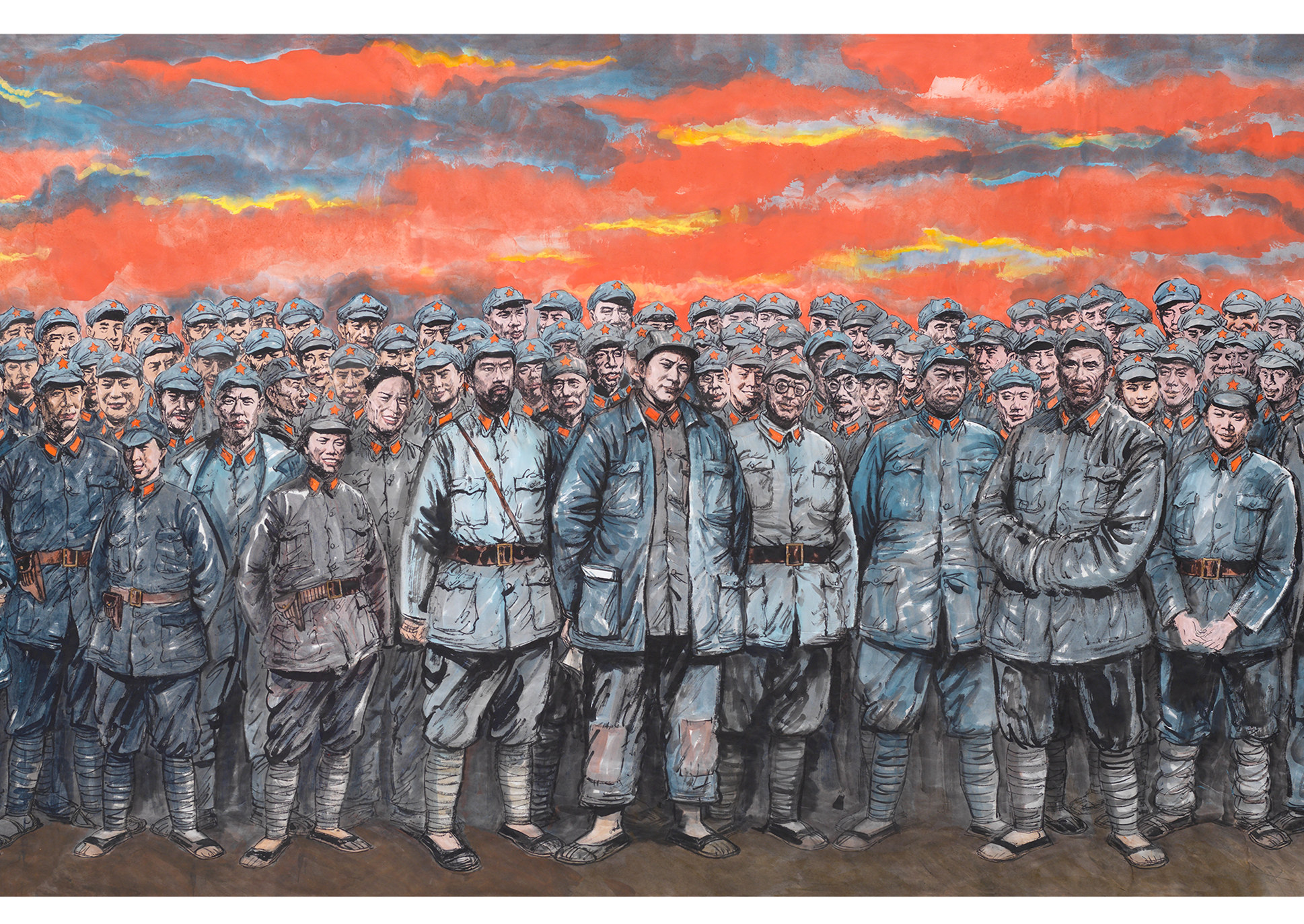 《紅色地平線》是為中國共產黨建黨一百周年而創作的百幅系列作品之中規模最宏大,篇幅最長,人物最多的一幅作品。作品創作歷時一年半的時間,長14.9米。于信強告訴記者其創作思想:一,中國工農紅軍的長征是中國戰爭史乃至世界戰爭史上的奇蹟,紅軍的長征為中國革命的勝利奠定了夯實的基礎。二,用中國畫濃墨重彩的畫法塑造了三百多位紅軍領導人及將領在歷盡艱難險阻雖衣衫襤褸,但軍容整齊的歡聚勝利的場景,以墨線勾勒出每一位紅軍將士滄桑的面孔,用誇張的筆法刻畫突顯一雙雙跋山涉水、穿着草鞋走向勝利雙腳。