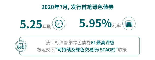 憑藉綠色指標的不斷突破,2020年7月,旭輝首次發行合計5億美元、利率5.95%的5.25年期境外綠色債券,獲評標準普爾綠色債券E1最高評級,並作為首個內地房企獲得香港品質保證局(HKQAA)頒發的「綠色金融發行後階段」證書。該綠色債券亦被港交所「可持續及綠色交易所(STAGE)」收錄,旭輝因此成為「綠色交易所」首批企業中唯一的中國內地房企。