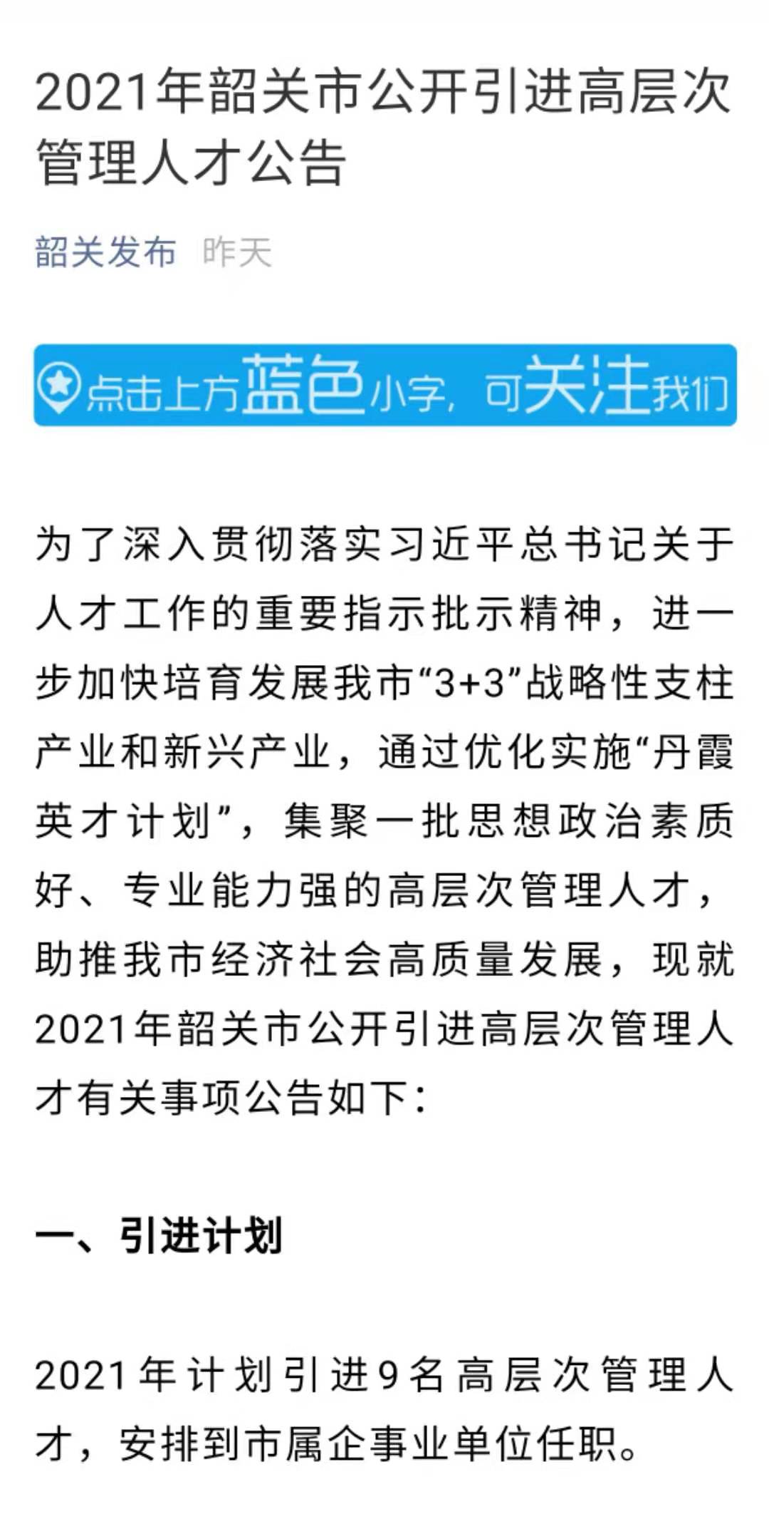 記者從廣東韶關有關部門獲悉,為加快培育發展韶關「3+3」戰略性支柱產業和新興產業,通過優化實施「丹霞英才計劃」, 2021年,韶關計劃引進9名高層次管理人才,安排到市屬企事業單位任職,並已在韶關市人民政府官方網站和韶關發佈平台發出公告面向全社會公開招聘。