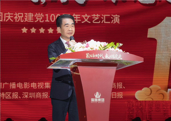 海雅集團董事局主席塗輝龍致辭,他表示,偉大的中國共產黨迎來了她100周歲的華誕。在這舉國同慶的美好時刻,海雅集團隆重舉行慶祝建黨一百周年的文藝匯演,是在用海雅人的方式慶賀黨的生辰,用海雅人飛揚的激情禮贊黨的偉大,用海雅人深情的歌聲謳歌黨的光輝歷程,感謝黨的恩情,祝願祖國未來更加美好。他表示,中國共產黨領導的中國特色社會主義道路是中國人民走向民族復興的唯一正確之路,我們必須堅定不移地走下去。特別是“新冠”疫情肆虐全球以來,在以習近平同志為核心的黨中央堅強領導下,全國人民萬眾一心,眾志成城,以最快的速度取得了“武漢保衛戰”和全國疫情防控戰爭的決定性勝利,在世界上一枝獨秀。進一步彰顯了我們黨的強大凝聚力和號召力,彰顯了黨領導下的社會主義制度的優越性。他還表示,現階段集團正在積極探索創新型黨建工作,積極向非公有制經濟組織黨委學習、交流,樹立“黨建與企業文化相融合、內外互聯互通、相互促進”的海雅黨建發展戰略,增強集團黨建品牌影響力,打造海雅自身人才培養生態圈。