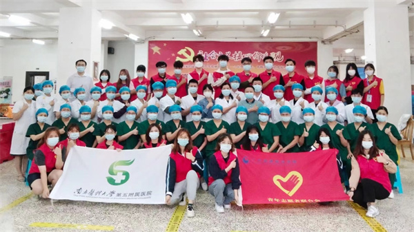 南方醫科大學第五附屬醫院的白衣天使和廣州城建職業學院的青年志願者合影
