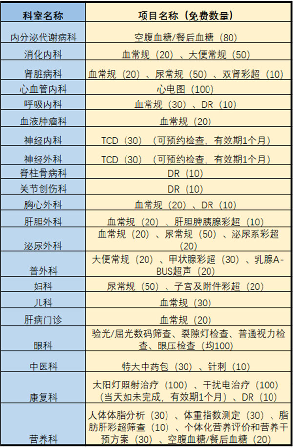 21個科室將開設免費檢查檢驗項目,包括血常規、心電圖、彩超等,部分項目可預約檢查,有效期為1個月。普外科、營養科、全科、中醫科、康復科、體檢門診將在門診大廳開展現場健康諮詢、免費血壓血糖測量(6月25日上午8:00-12:00)。