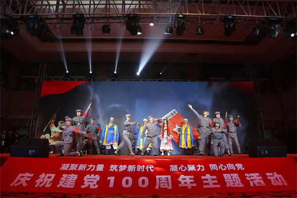 下午四點,「凝心聚力?同心向黨--新的社會階層人士慶祝建黨100周年」主題活動文藝匯演正式開始。本次文藝匯演全部由瀋陽市新聯會百餘名會員參演,一首首紅色歌曲、一段段紅色故事、一部部中國共產黨歷史回顧的片段,讓現場熱血沸騰。在活動尾聲全場新聯人揮舞着手中的囯旗,共同唱響《沒有共產黨就沒有新中國》,在激昂的歌聲中將本次活動推向高潮。