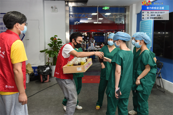 6月22日,根據深圳市疫情防控要求龍崗區坂田全街道開展通宵檢測,在得知消息的第一時間,位於該街道東海王團體義工隊領隊林進傑馬上與街道義工聯溝通,並聯動園區愛心企業喵鮮人共同為此輪通宵檢測的醫護人員,工作人員親自製作上百份冰咖,送上疫線,助力通宵檢測。