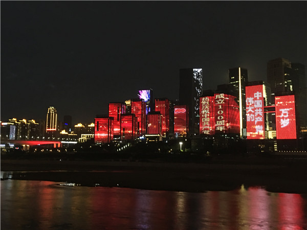 22日晚,江水山城重慶展現大型主題燈光秀,重慶大劇院、江北嘴、解放碑等主要地標性建築,慶祝中國共產黨建黨100週年的主題標語不停閃爍,照亮夜空,呈現江面,精彩紛呈。