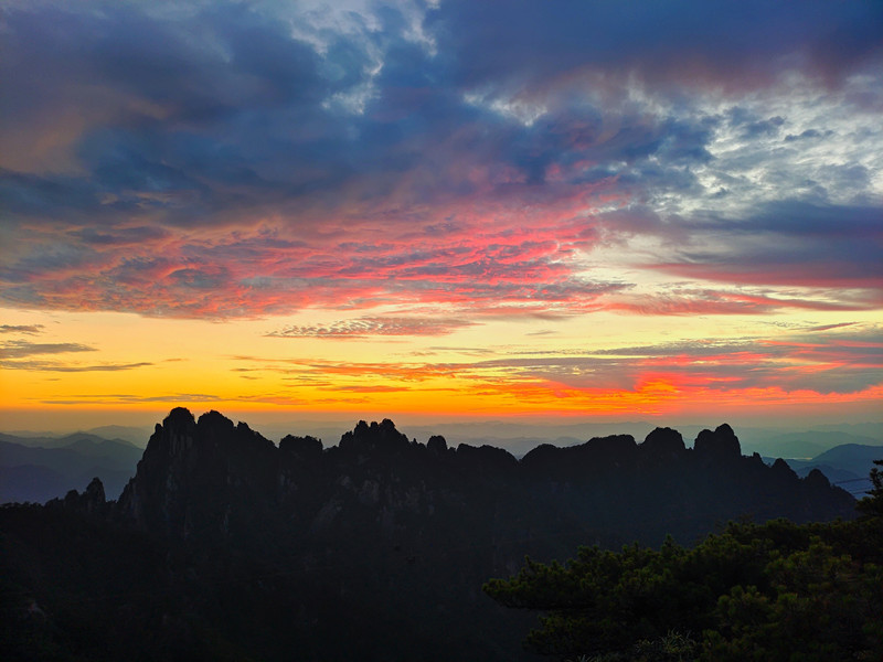 23日傍晚,絢麗的晚霞幾乎驚豔了黃山之巔的每一位遊客。落日的餘暉將西邊的天際染成一縷縷豔麗的綢緞,紅色、金色、粉色、紫色、藍色……他們交織或疊加,又像油畫般肆意潑灑開,明暗對比下,山峰的與松石的輪廓更加靈巧生動。