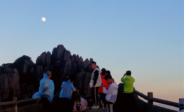 而後,彩霞慢慢失去了色彩、悄然退場,一輪皓白的圓月緩緩升起,在夜色中與黃山之巔的松枝作伴、巧石為友,點綴著夏日的夜空。