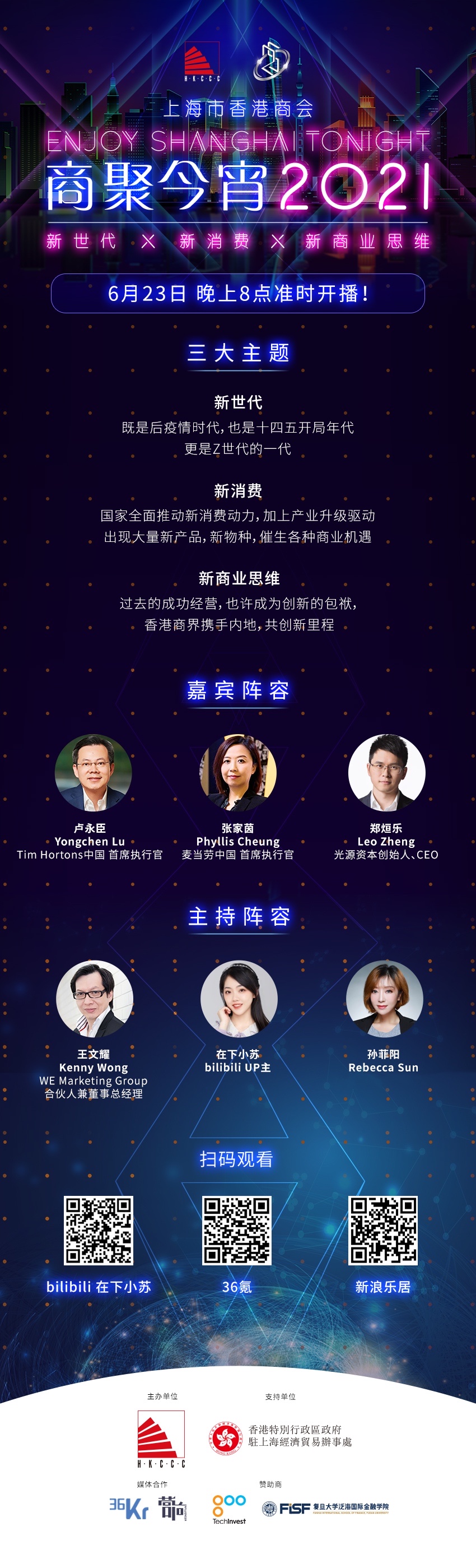 6月23日晚,上海市香港商會舉辦了「商聚今宵2021 Enjoy Shanghai Tonight」直播活動,這是香港商會成立25周年及香港回歸24周年系列活動之一,主題為「新世代、新消費、新商業思維」。主講嘉賓麥當勞中國行政總裁張家茵、Tim Hortons中國行政總裁盧永臣、光源資本創始人、CEO鄭烜樂、bilbili UP主在下小蘇等與觀眾分享並互動。