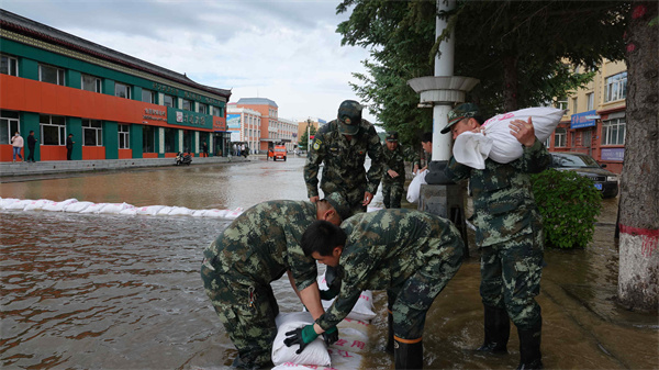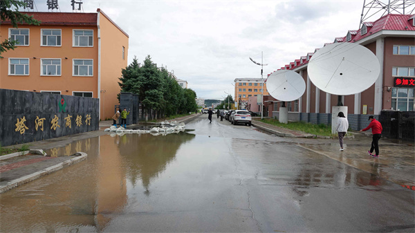 18日凌晨,漲勢很快的洪水正迅猛地漫過中央大街,向街邊的農商銀行機關大樓、稅務局辦公樓和電視台辦公樓等處湧來,而這幾個沿街單位地勢較低,很容易受到洪水的侵襲。為儘量控制洪水水勢,最大限度減少洪水造成的損失,塔河縣防指迅速調集人力物力,主要領導靠前指揮,廣大救援官兵奮勇爭先,在幾個臨街單位外圍用沙袋圍壩攔堵,並調動多台高壓水泵抽水抗澇,給幾個單位的救援提供了極大地助力,也為其自救創造了更多的時機。