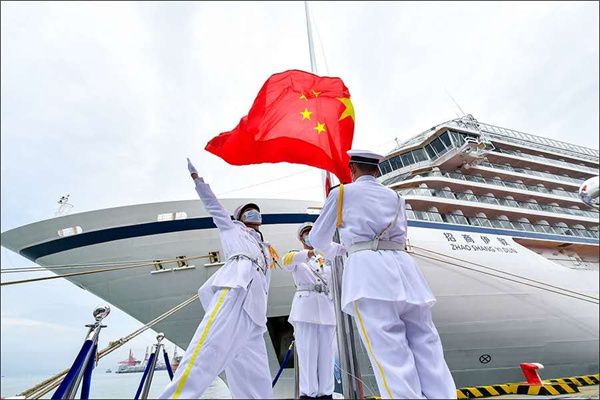 6月26日,伴隨著莊嚴雄壯的國歌聲,五星紅旗在深圳蛇口郵輪母港冉冉升起,以“見證歷史,傳承啟今”為主題的中國首艘五星旗豪華遊輪——“招商伊敦”號命名暨首航儀式隆重舉行。招商局集團董事長繆建民、總經理胡建華,深圳市副市長張華,招商局集團董事段湘暉、副總經理李百安等領導及嘉賓40多人出席活動,共同見證中國首艘五星旗豪華遊輪——“招商伊敦”號遊輪的命名和首航。