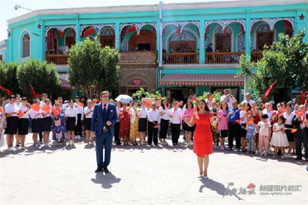 6月24日。喀什市各族群眾在喀什古城百年老茶館前參加《唱支山歌給黨聽》快閃活動。艾麗菲熱攝