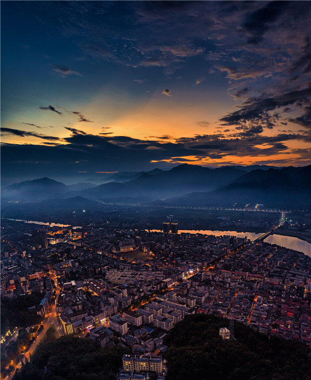 夜幕下鳥瞰靖安縣城,清逸祥和。(顏衛民 攝)