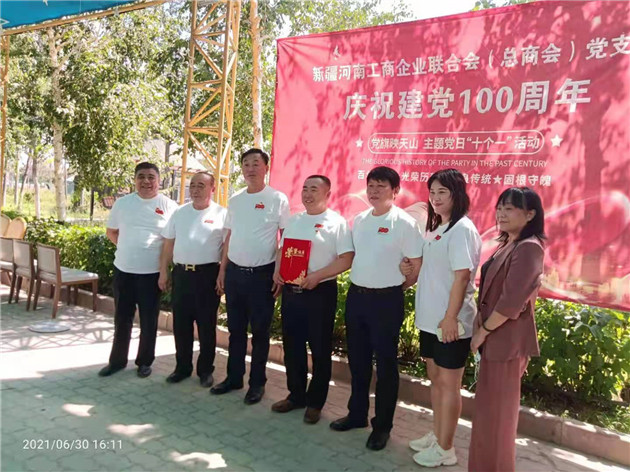 新疆河南工商企業聯合會(總商會)為慶祝中國共產黨成立100周年開展紅歌比賽,商會維權和文化傳播委員會主任、執行會長樊建東為大家朗誦毛澤東詩詞《沁園春·雪》,河南省信陽市人民政府駐烏魯木齊辦事處黨支部劉凡女士為大家演唱了巜我和我的祖國》歌曲。值得一提的是商會應急管理委員會主席、常務執行會長王新河為商會贊助100件印有慶祝中國共產成立100周年體恤衫,活動統一了服裝。