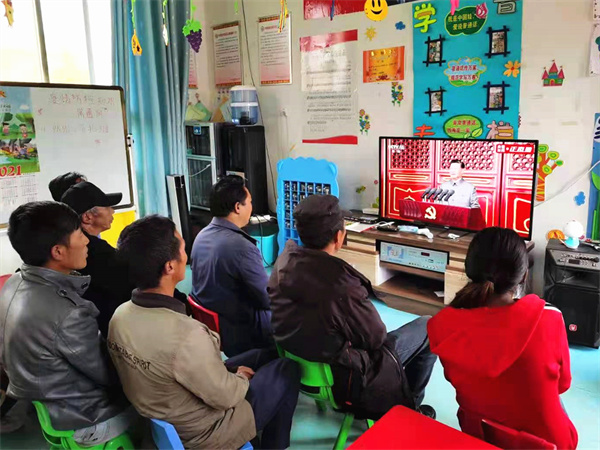 棉椏鎮小學教師在教室收看慶祝中國共產黨成立100周年大會的盛況直播