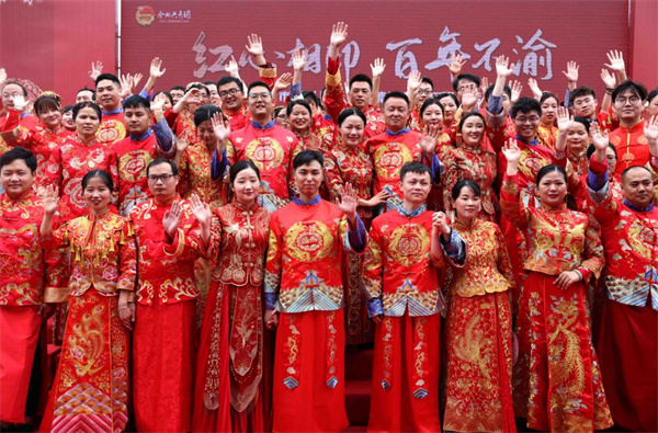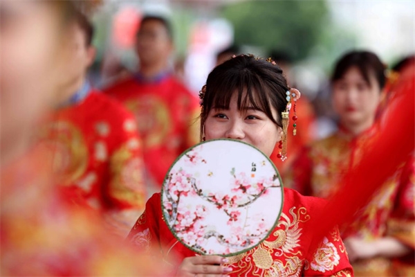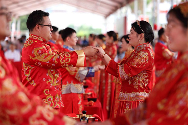 7月3日,在安徽省合肥市瑤海區青年創意田園,百位新人身着華美中式禮服參加傳統婚典禮儀。當日,由合肥市委宣傳部、市文明辦、團市委、市婦聯等聯合主辦的「紅心相印,百年不渝」合肥市第八屆青年集體婚禮青年黨員專場在瑤海區青年創意田園舉行,參與婚禮的百位新人經過卻扇禮、盥洗禮、禮天謝地、解纓禮、結髮禮、盟誓禮、執手禮、合卺禮、新人拜謝禮等中式婚典禮儀環節,讓新人們感受到傳統婚典禮儀的獨特魅力,傳承經典中華文化,弘揚節儉婚禮新風尚。