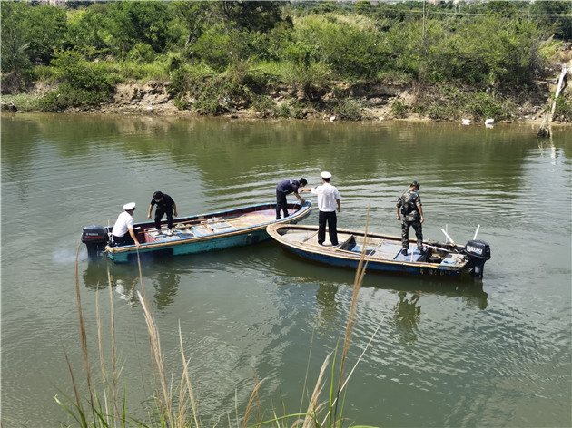 由於在聯合執法前期,深圳市海洋綜合執法支隊大鵬大隊嚴密落實了信息摸查、水域排查等前期工作,執法人員抵達新大片區海域後,精準佈控,迅速鎖定藏匿在新大片區河涌和水塘的「三無」船舶。儘管灘涂水淺,烈日高照,「三無」船舶藏匿在樹林中拖離有較大難度,但全體執法人員充分發揚不怕苦不怕累的精神,團結協作,海上執法組有人在船上操控船舶,有人下水手動將船舶推離灘涂,岸上執法組緊密配合,有序安排吊車成功將14艘涉事「三無」船舶吊上岸,並依法拖至指定地點作進一步調查處理。
