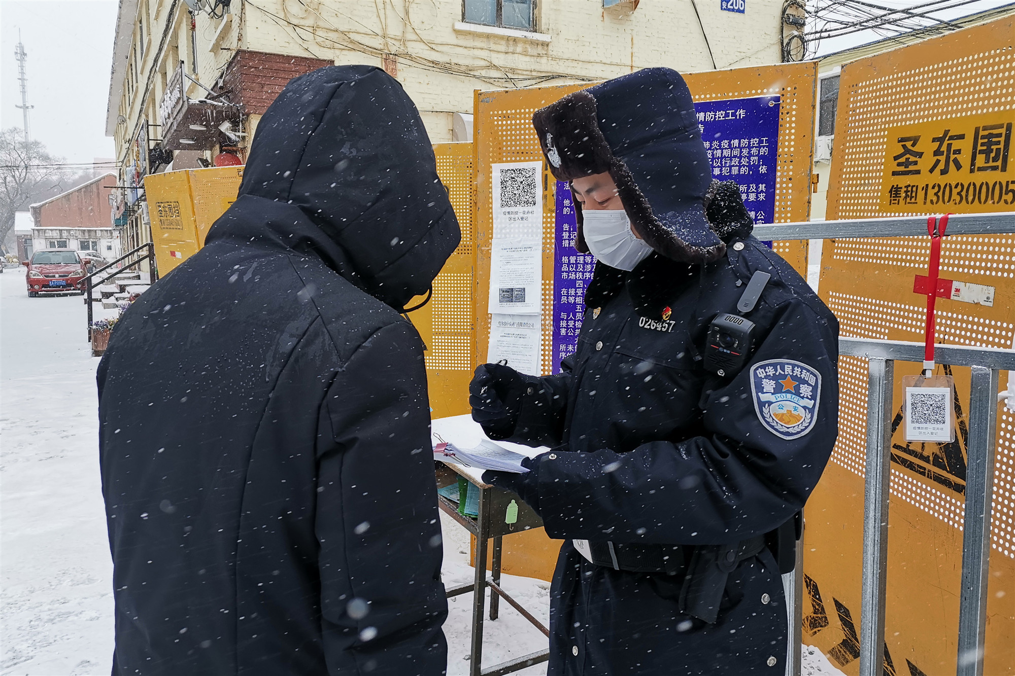 2021年初,哈爾濱市進行全民核酸檢測,郭東旭又毅然決然地衝到了核酸檢測第一線。他身穿防護服、手持大喇叭,每天十餘個小時的執勤,他一干就是12天,直到核酸檢測工作圓滿完成。郭東旭工作的檢測點始終井然有序,沒有一起糾紛發生。長時間、高強度的工作,雖然執勤的環境天寒地凍,可他的防護服每日都是濕透的,但他從未說過一句苦和累,默默地維持着秩序,只留下一個「小郭警官」的忙碌背影。