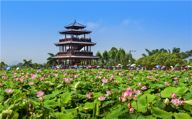 記者近日從廣西貴港市獲悉,「永遠跟黨走」貴港市第十一屆「和為貴」文化節暨第八屆「美麗貴港 我愛荷城」荷花展啟動儀式,將於7月23日在覃塘區荷美覃塘盛大開幕。屆時,共展出盆栽荷花5萬盆及連片荷花6500多畝,推出一系列參與性廣、互動性強、雅俗共賞的群眾文化和旅遊消費活動,讓遊客共同分享一場「色香味美」的「荷文化盛宴」。