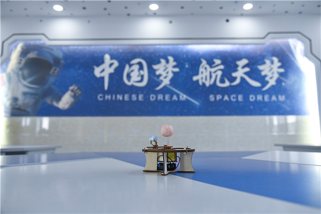 600平方米的開敞物理空間,循着指示標識,藍色背景的太空人形象宣傳畫首先闖入眼帘。穿越象徵星空的「宇宙長廊」,走進展廳,不同型號的中國航天運載火箭一字排開,探月車模型、「飛天」艙外航天服樣品等陳列擺放。再往裏走,各具特色的航天科技實驗室、創客空間開放實驗室、科技創新探究實驗室、科技藝術體驗室連成一排……