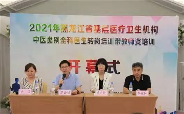 近日,由黑龍江省中醫藥管理局主辦、黑龍江中醫藥大學繼續教育學院承辦的「2021年黑龍江省基層醫療衛生機構中醫類別全科醫生轉崗培訓帶教師資培訓」在哈爾濱哈西稀頓歡朋酒店會議中心舉行,來自全省各地16個培訓基地的73位代表參加培訓。黑龍江中醫藥大學副校長羅會斌致辭,黑龍江省中醫藥管理局科教處處長黃文靜、黑龍江中醫藥大學繼續教育學院院長李樹和出席開幕式。開幕式由黑龍江中醫藥大學繼續教育學院盧芳副院長主持。