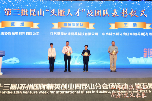開幕式上,昆山在「人才科創新政4.0版」的基礎上,發佈「頭雁人才」、雙創人才、產業人才、高技能人才等四個專項政策,並為2020年度昆山市「頭雁人才」及團隊頒獎,其中朱蓓薇團隊獲評「頭雁人才」團隊,范斌、王浩被評為「頭雁人才」。
