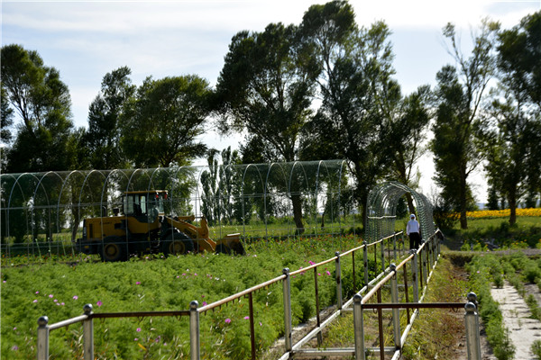 七月的甘肅省瓜州縣布隆吉鄉葫蘆河旅遊產業園區,工人正忙着搭建景觀花架,扶植工藝葫蘆藤條上架,花田裡黃的、紅的、紫的百日草、波斯菊、馬鞭草等花卉迎風綻放,成片鮮艷奪目的花朵隨風飄搖,勾勒出一道靚麗的風景線。