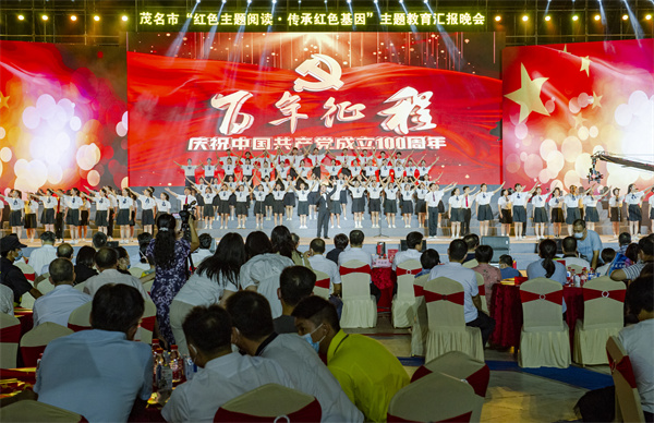 以慶祝建黨100周年,紅色文化進校園為主題,7月12日,由中共茂名市委宣傳部指導,茂名市委教育工委、茂名市教育局主辦,茂名市廣播電視台承辦的茂名市「紅色主題閱讀?傳承紅色基因」主題教育活動匯報晚會在茂名文化廣場上演,近千名師生觀看了演出。