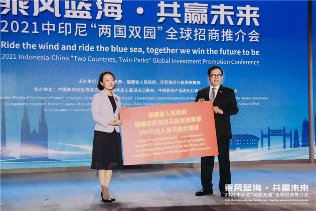 15日,“一帶一路”倡議的國家級戰略合作對接再迎高潮——主題為“乘風藍海、共贏未來”的中印尼“兩國雙園”全球招商推介會,以線下與線上結合的方式在福州和印尼多地聯線舉辦。福州主会场現場,福建省人民政府向印尼海洋與投資統籌部捐贈價值300萬元人民幣的醫療物資,向抗疫中的印尼人民表達支持。