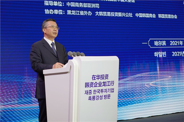 張夏成在致辭中說,黑龍江省地處聯通東北亞和歐亞地區的樞紐位置,有着豐富資源優勢,與韓國在貿易投資方面交流合作潛力巨大。希望雙方繼續深化食品、鐵路車輛、鋼鐵等領域的合作,推動在食品、農產品加工、文創等領域資源及技術等融合發展,探討促進低碳、生物醫療等領域合作。希望黑龍江省為韓國企業提供優良投資環境和發展空間,期待雙方共謀發展商機,深化合作夥伴關係。