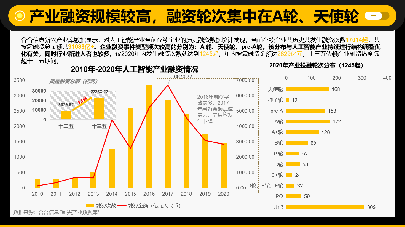 近日,合合信息旗下啟信燈塔數據研究中心聯合上海和誠創芯企業管理諮詢有限公司發佈《人工智能(2010-2021)行業發展研究報告》。該報告顯示,通過大數據透視人工智能產業發展,其科技創新及轉化能力逐年提高,產業發明專利佔比達65%;2010年到2020年人工智能企業融資總額達3萬億,市場前景廣闊。