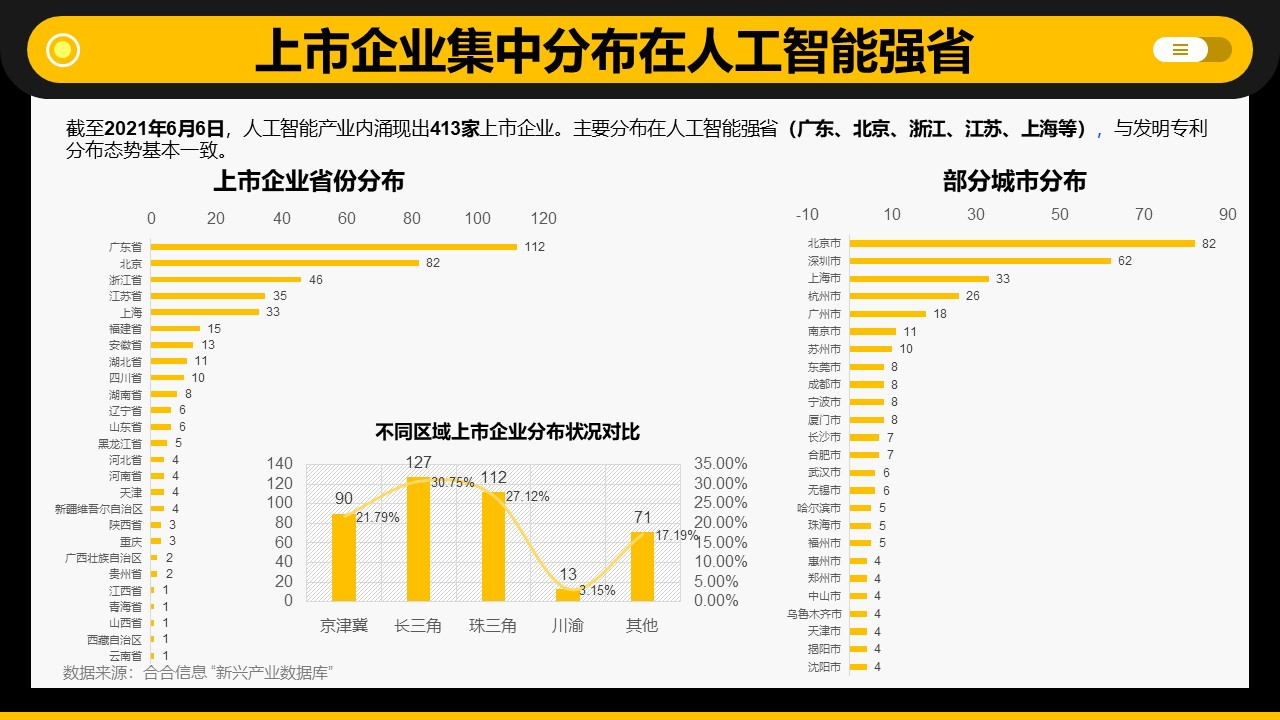 從地域分佈分析,人工智能產業從技術創新到發明專利,主要集中在長三角及京津冀地區,北京、深圳創新性領先全國。由於人工智能與實體經濟融合發展進程的加快,人工智能科技產業創新資源逐漸「北上」、「南移」的趨勢明顯,各個創新應用先導區競爭格局開始顯現。