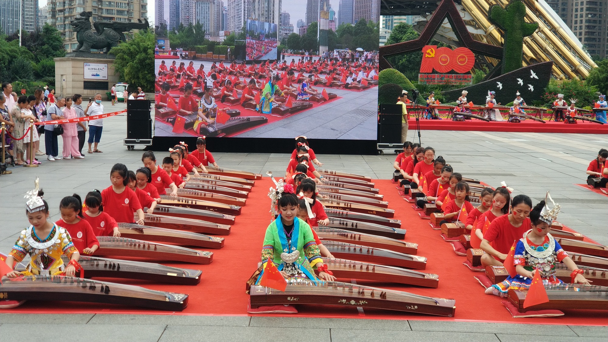 (香港商報訊)為慶祝中國共產黨成立100周年,謳歌中國共產黨領導中國革命取得的偉大成就,由貴州省文化館、貴州省公共文化發展中心主辦,貴州省民族管弦樂學會古箏學會協辦的「箏心向黨·慶祝建黨百年華誕——百人古箏齊奏」活動,於17日在貴陽市築城廣場舉行。