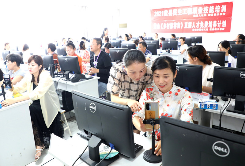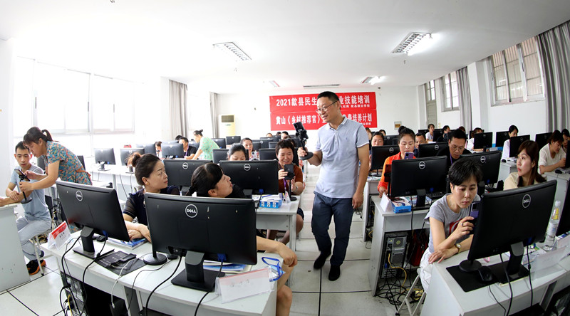7月16日,安徽歙縣舉辦2021民生工程職業職能培訓班,黃山市青創文化傳播有限公司負責人仰時威(中)給學員講授網路直播帶貨使用方法。