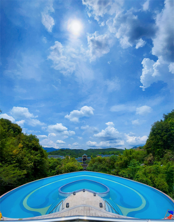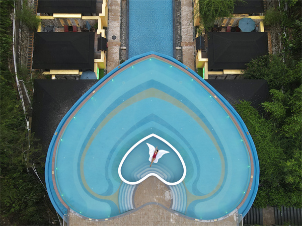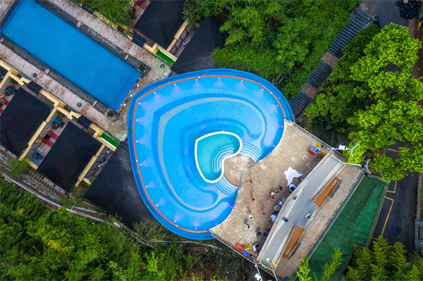該心形無邊懸空泳池由世界著名華人設計師設計,建在山谷之間,由 26根鋼結構支柱支撐,高達10米。