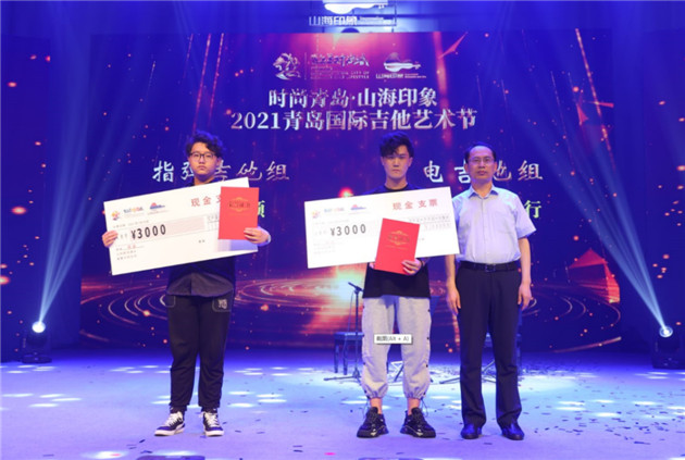 中共嶗山區委常委、宣傳部部長黃應勝為李碩、李健行頒授了指彈吉他組、電吉他組冠軍獎項。