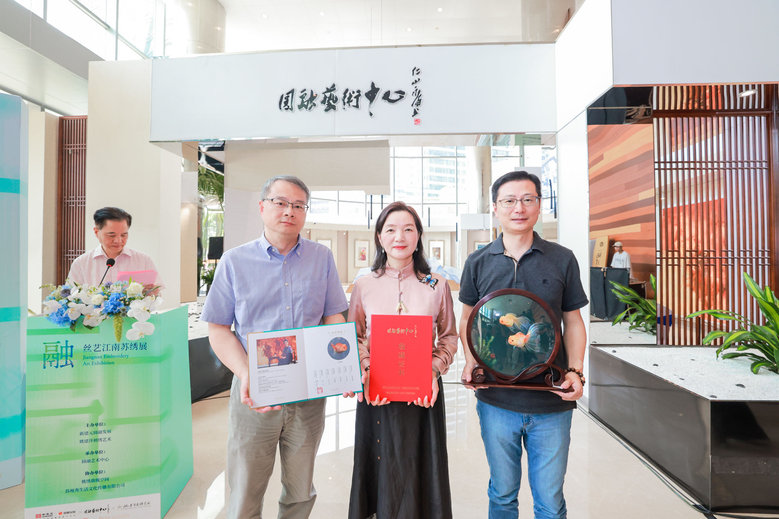 展覽現場,蘇繡藝術家姚建萍向圓融藝術中心捐贈了自己的蘇繡雙面繡藝術作品《年年有餘》,此作品是姚建萍特意為本次展覽所創作的。圓融發展副總裁俞繼東與姚建萍交換收藏證書,圓融藝術中心創辦人薛文崗代表圓融藝術中心接收了作品並對藝術家表示感謝,作品將被收藏在圓融藝術中心。