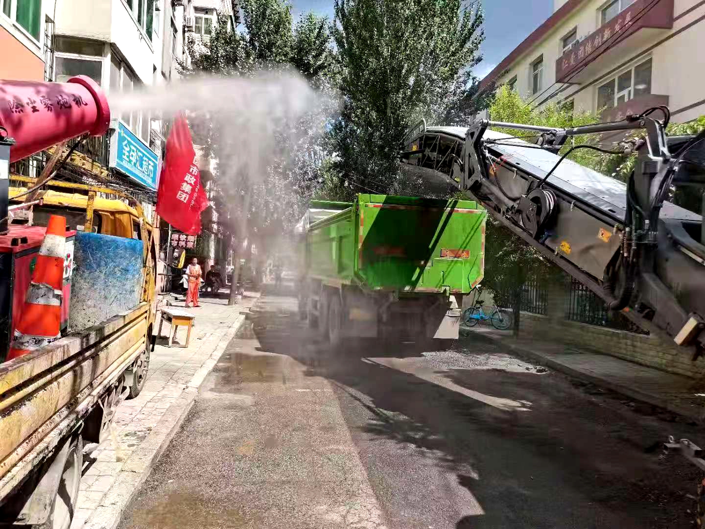 瀋陽鐵西區城市管理局市政科科長陳恰說,與原來哪壞修哪的「打補丁」方法不同,「銑刨蓋被」就是把舊路面刨掉再鋪上新路面的施工方式。先用銑刨機破開舊路面,清運走殘土,再用攤鋪機鋪好新路面,最後畫好標線,一條嶄新的道路就完成了。這次採用的是全機械作業,效率非常高。施工同時,城管局使用不同型號霧炮機,起到降塵的作用,避免了對道路兩側居民的灰塵污染。
