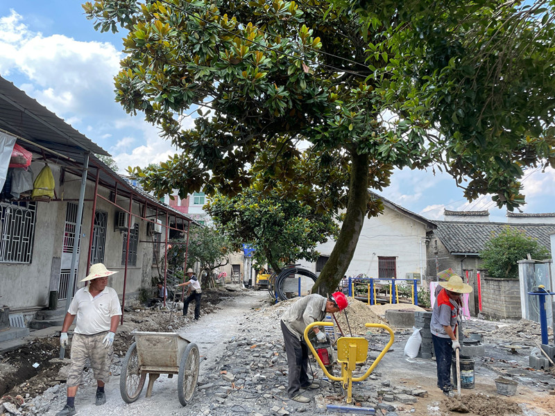 7月21日,在安徽黟縣財政局宿舍改造工程現場,工人們正在進行房屋外立面改造及社區道路硬化。據瞭解,黟縣財政局宿舍建於上世紀,如今面臨著道路坑窪、管道老化等問題。目前,工人們正在抓緊施工改造,讓老舊社區“舊貌換新顏”。