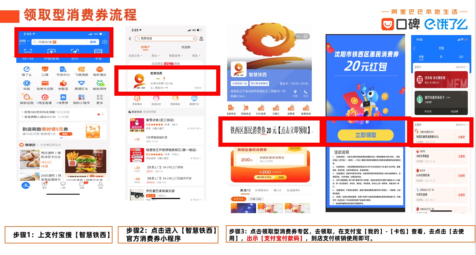此次發放的100萬元消費券將在阿里巴巴本地生活口碑平台以電子消費券形式發放。市民可在支付寶APP首頁搜索「智慧鐵西」或「鐵西新瑪特」「杉杉奧萊」任意關鍵詞,進入商圈小程序進行領取或購買消費券,並在支付寶「卡包」查看,到線下指定門店支付核銷使用。