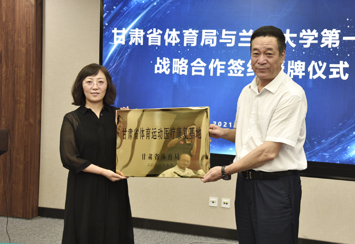 會上,甘肅省體育局黨組成員、副局長劉新平和蘭大一院院長李汛簽訂簽署戰略合作協議。劉新平為蘭大一院授牌「甘肅省體育運動醫療康復基地」。