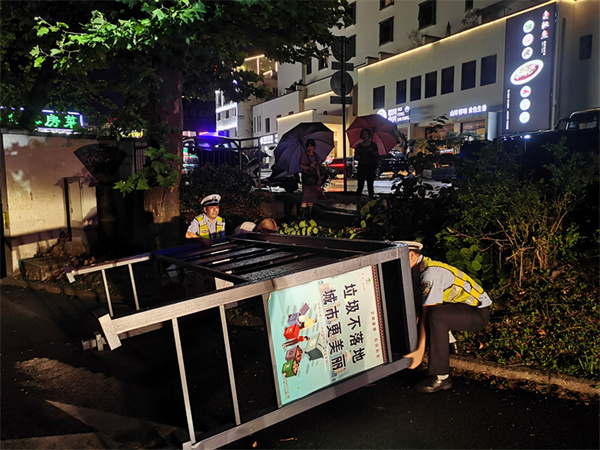 景區交警夜間冒雨搬移被風吹倒的不銹鋼棚 郝義明攝